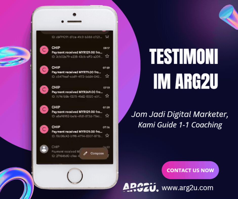 "ARG2U betul-betul mengubah hidup saya. Saya dulu buta tentang pemasaran internet, tapi sekarang saya ada bisnes online yang makin maju. Bahan-bahan pembelajarannya mudah difahami, dan mentornya sangat membantu.